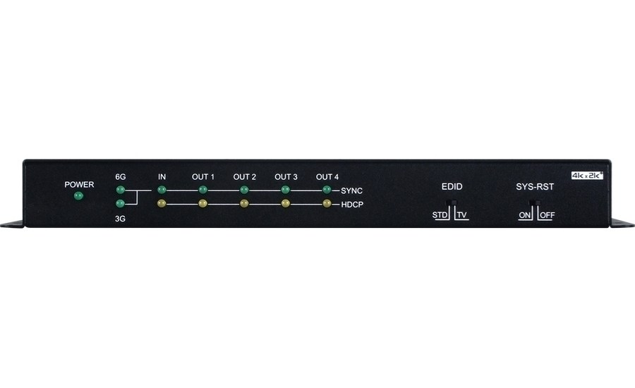 Cypress CPLUS-V4T - усилитель-распределитель 1:4 сигналов интерфейса HDMI разрешения 4Kх2K, 3D. Поддерживает сигналы разрешением до 4096 x 2160/60 с цветовым пространством YUV 4:4:4, HDR до 12 бит, защищенные HDCP 1.4 или 2.2. Полоса пропускания 600 МГц. Два режима работы с EDID-данными – «Стандарт» и «ТВ». С помощью CEC-команды переключает все подключенные дисплеи на отображение сигнала с распределителя. Поддерживаются кодеки многоканального встроенного аудио LPCM 7.1, Dolby TrueHD, Dolby Digital Plus и DTS-HD Master Audio с частотой дискретизации до 192 кГц.