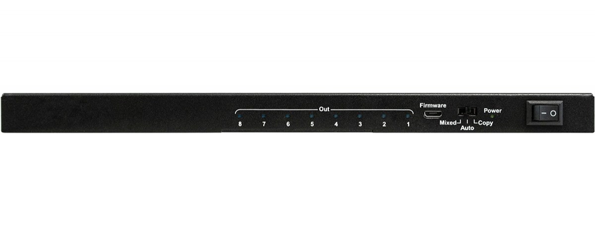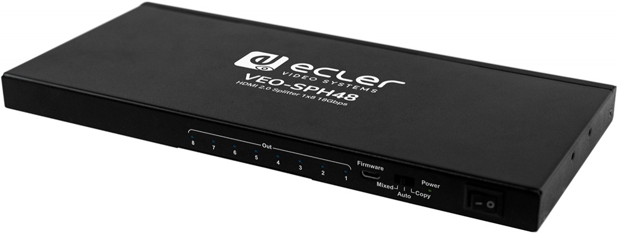 Ecler VEO-SPH48 - усилитель-распределитель 1:8 сигналов интерфейса HDMI 2.0. Поддерживаются разрешения до 4096x2160/60 (4:4:4), HDR 10, 3D-контент, HDCP 1.4/2.2. Полоса пропускания устройства 600 МГц. Обеспечиваются три режима работы с EDID-данными. Поддерживаются кодеки многоканального встроенного аудио LPCM 7.1, Dolby TrueHD, Dolby digital Plus и DTS-HD Master Audio; частота дискретизации аудио до 192 кГц.