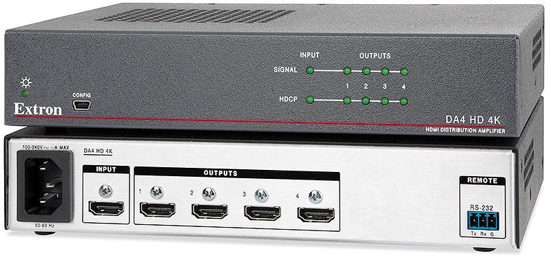 Усилители-распределители HDMI 4K Extron 60-1481-01. Серия DA HD 4K от Extron включает в себя усилители-распределители с одним входом и множеством выходов для сигналов HDMI с разрешением до 4K. Наряду с поддержкой скорости передачи данных до 10,2 Гбит/с, 3D и аудиоформатами HD без потерь они предлагает ряд удобных для интегратора функций, таких как автоматическая эквализация для компенсации потерь во входном кабеле, автоматическое управление глубиной цвета и возможность блокировки выходов (muting). Они также используют технологии EDID Minder® и Key Minder® от Extron для обеспечения постоянного обмена данными EDID между подключёнными устройствами и одновременного распределения HDCP-зашифрованного контента. Усилители-распределители DA HD 4K доступны с выходами в количестве от двух до шести и идеально подходят для проектов, где требуется надёжное распределение одного сигнала источника HDMI на несколько дисплеев.