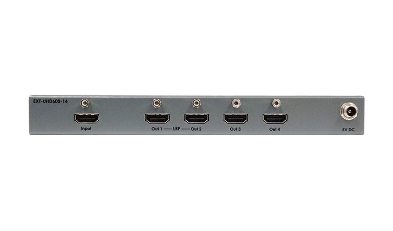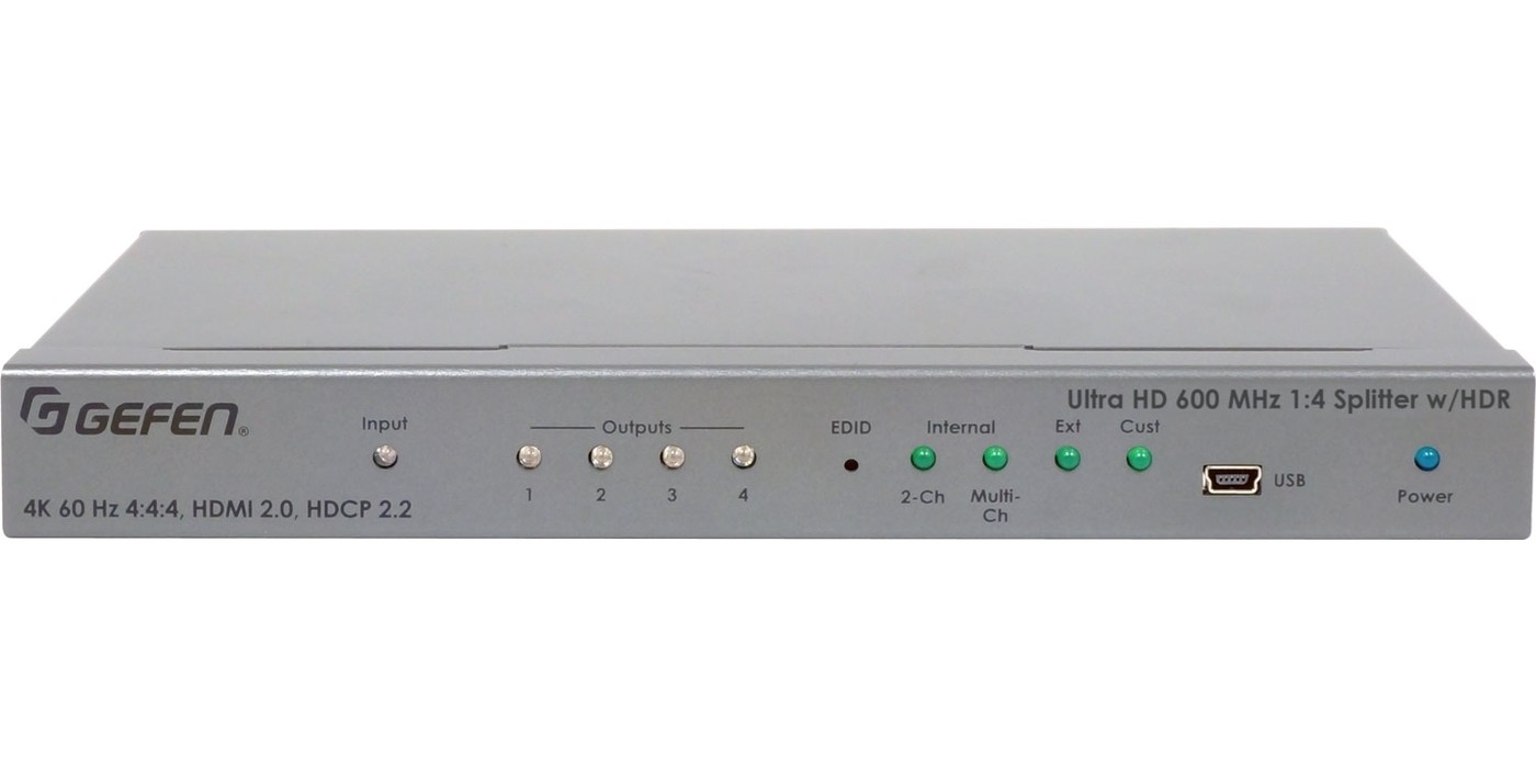 Gefen EXT-UHD600-14 - усилитель-распределитель 1:4 сигналов интерфейса HDMI с HDCP 1.4 или 2.2 разрешения 4Kх2K, 3D с HDR. Поддерживаются сигналы разрешением до 3840x2160/60, 4096x2160/60 с цветовым пространством YUV 4:4:4 и Deep Color 10 бит, сигналы 1080p с Deep Color 12 бит. Полоса пропускания 600 МГц. Десятиуровневое каскадирование без HDR, с HDR – шестиуровневое. Поддерживаются кодеки многоканального встроенного аудио LPCM 7.1, Dolby Atmos, Dolby TrueHD, DTS:X и DTS-HD Master Audio до 192 кГц. Выходные порты HDMI с LRP (5 В, 500 мА). Совместим с ПО Gefen Syner-G.