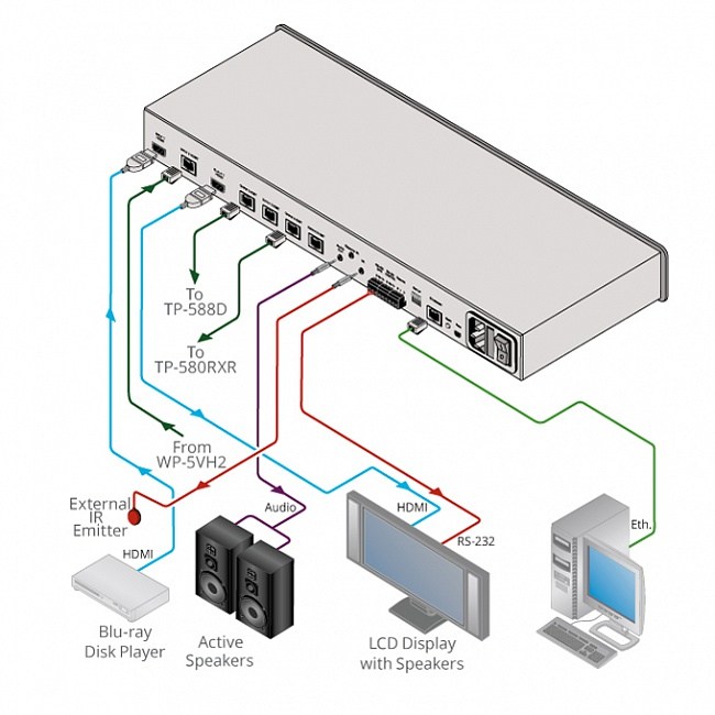 | Выходы | 1 x HDMI (female) сквозной входа HDMI; 4 x HDBaseT (витая пара), RJ−45 (female); 1 x стереофонический аудио, TRS Ø 3,5 мм (female); 1 x IR передатчик ИК-сигналов, Ø 3,5 мм (female) |