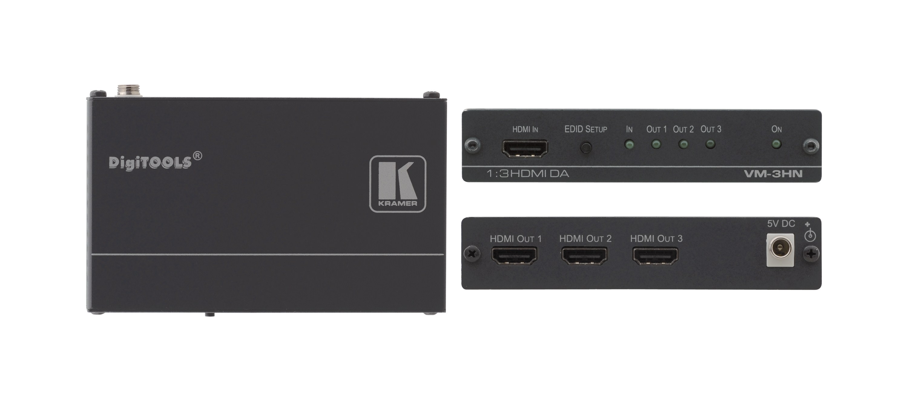VM-3HN - усилитель-распределитель для сигнала HDMI. Он выполняет перетактирование сигнала и компенсацию АЧХ кабеля, после чего выдает сигнал на три одинаковых выхода.