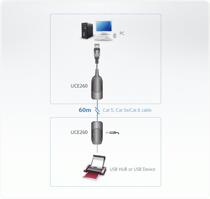 Устройство UCE260 может с легкостью передавать USB-сигналы на расстояние до 60 метров со скоростями передачи данных, соответствующим High Speed (480 Мбит/с) , Full Speed (12 Мбит/с ) и Low Speed (1.5 Мбит/с ), используя кабель Cat.5/5e/6. Не применяя какое-либо конфигурационное программное обеспечение или драйверы, данный USB-удлинитель позволяет Вам расположить Ваше устройство с интерфейсом USB или USB-концентратор на расстоянии до 60 метров от Вашего компьютера, преодолевая ограничения накладываемые стандартным USB-кабелем.