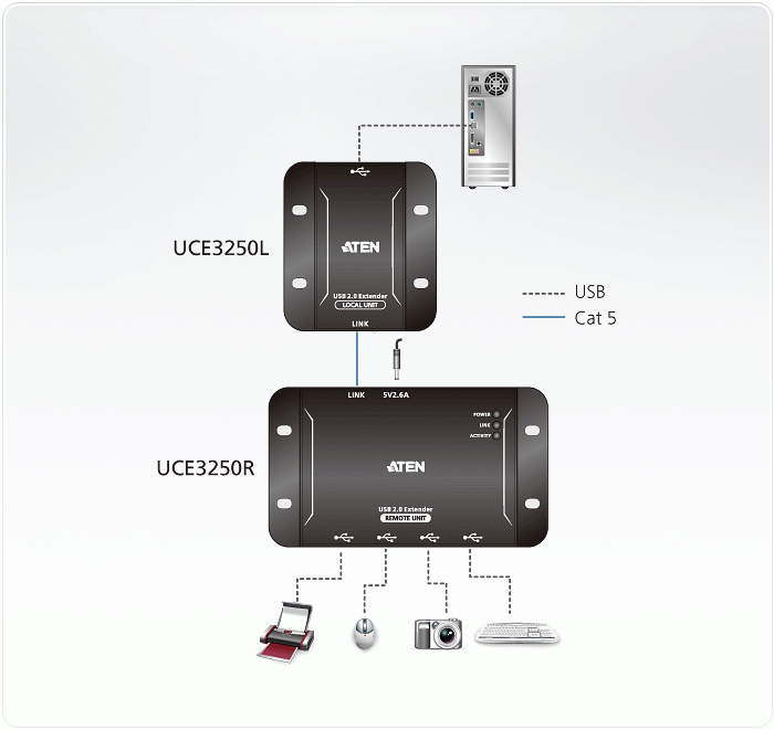 | 1x 4-портовый USB 2.0-удлинитель по кабелю Cat 5 UCE3250L (локальный модуль) 1x 4-портовый USB 2.0-удлинитель по кабелю Cat 5 UCE3250R (удаленный модуль) 1x адаптер переменного тока 1x кабель USB тип А - тип В 1x руководство пользователя |