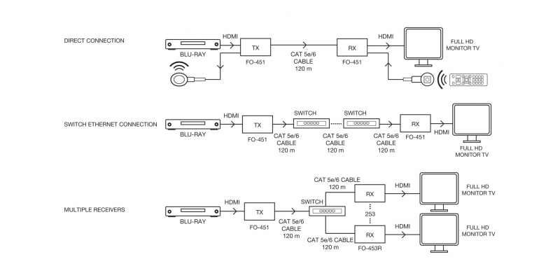 | Расстояние передачи | до 120 м при прямом соединении с разрешением 1080p, расширяется на 120 м с каждым уровнем коммутатора |