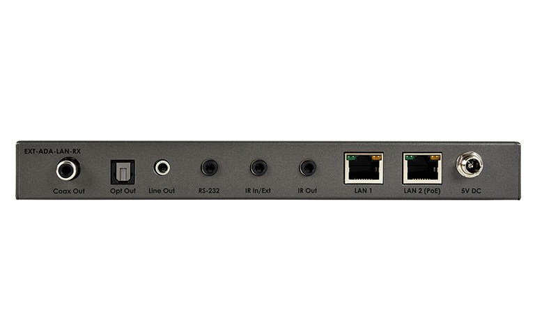 Gefen EXT-ADA-LAN-RX - приемник сигналов RS-232 (miniJack 3,5 мм), аналогового (miniJack 3,5 мм) и цифрового аудио (TOSLINK и RCA), двунаправленных сигналов ИК из IP-сетей 1000BaseT (2xRJ45), который принимает высококачественные сигналы по стандартным линиям категории 5е, 6. Питание устройства может осуществляться по PoE. Используемые сетевые IP-коммутаторы должны поддерживать Jumbo-кадры (8 Кбит или больше) и IGMP (для совместимости с графическими приемопередатчиками). Управление устройством осуществляется с помощью встроенного web-интерфейса, по Telnet и UDP. Приемники EXT-ADA-LAN-RX и совместимые с ними передатчики EXT-ADA-LAN-TX могут объединяться в «виртуальную матрицу» с участием 39000 передатчиков, а общее количество устройств может достигать 65000. Для физического управления коммутацией подходит устройство EXT-CU-LAN