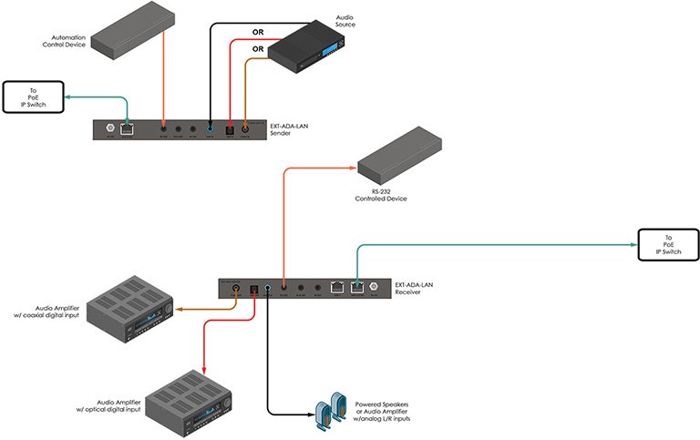 - Увеличивает расстояние передачи сигналов цифрового и аналогового аудио, ИК и RS-232, используя гигабитную локальную сеть
