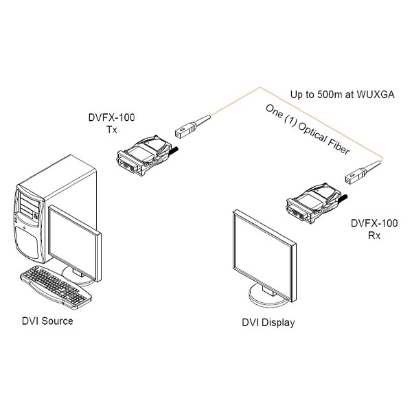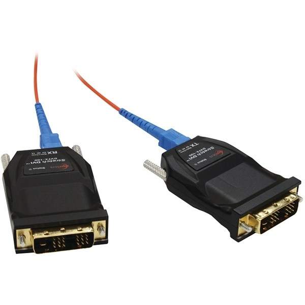 Opticis DVFX-100-TR - комплект устройств для передачи сигнала DVI по одному симплексному оптоволоконному кабелю. Передающий и приемный блоки удлинителя подключаются к DVI-разъемам источника и приемника сигналов и между собой соединяются одним оптоволокном. Оптические соединения типа SC Simplex. Удлинитель передает DVI-сигналы с разрешениями до WUXGA (1920x1200) 60 Гц на 500 м по многомодовому оптоволокну.