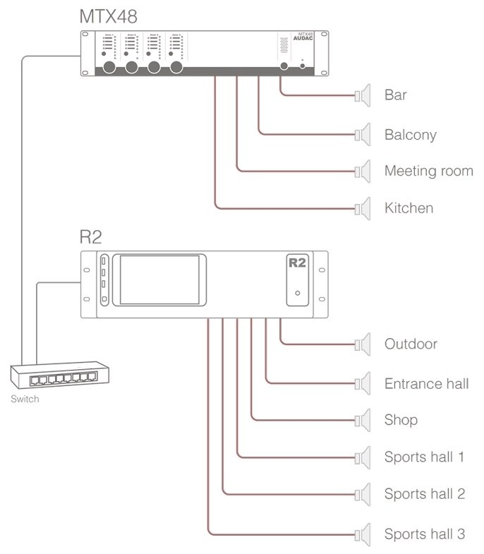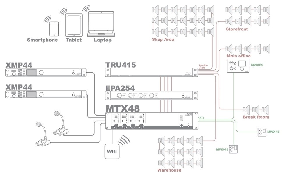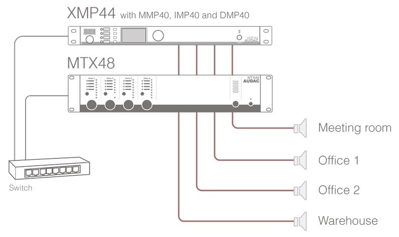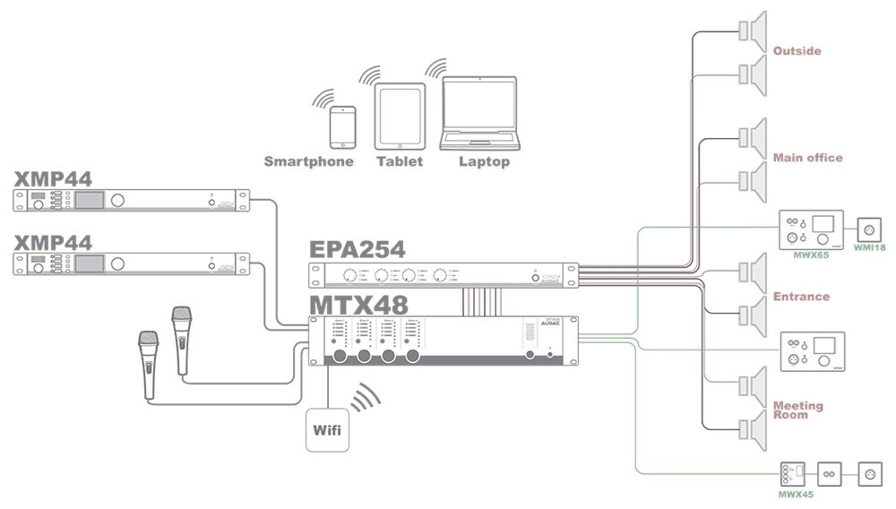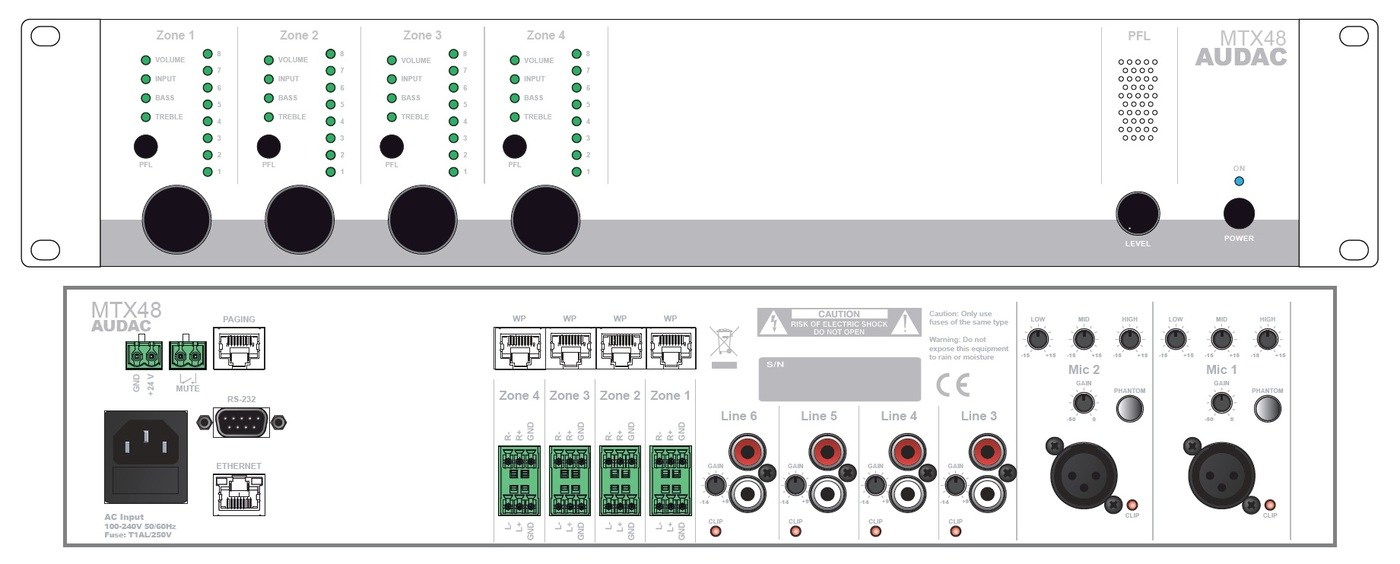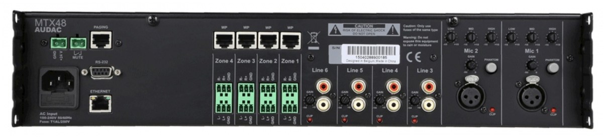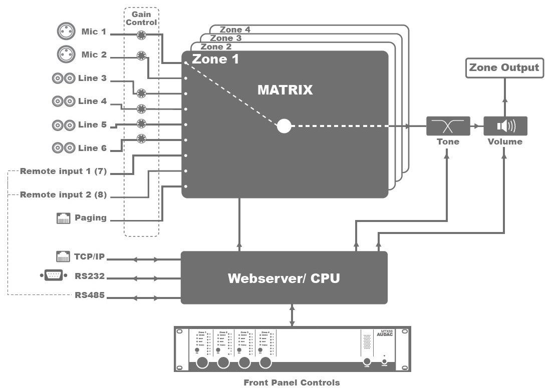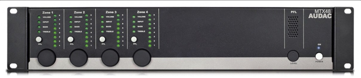 | Управление | кнопками с лицевой панели, RS-232, TCP/IP (RJ45), опциональная настенная панель (RS-485), Audac Touch™, web-интерфейс (HTML5, Flash) |