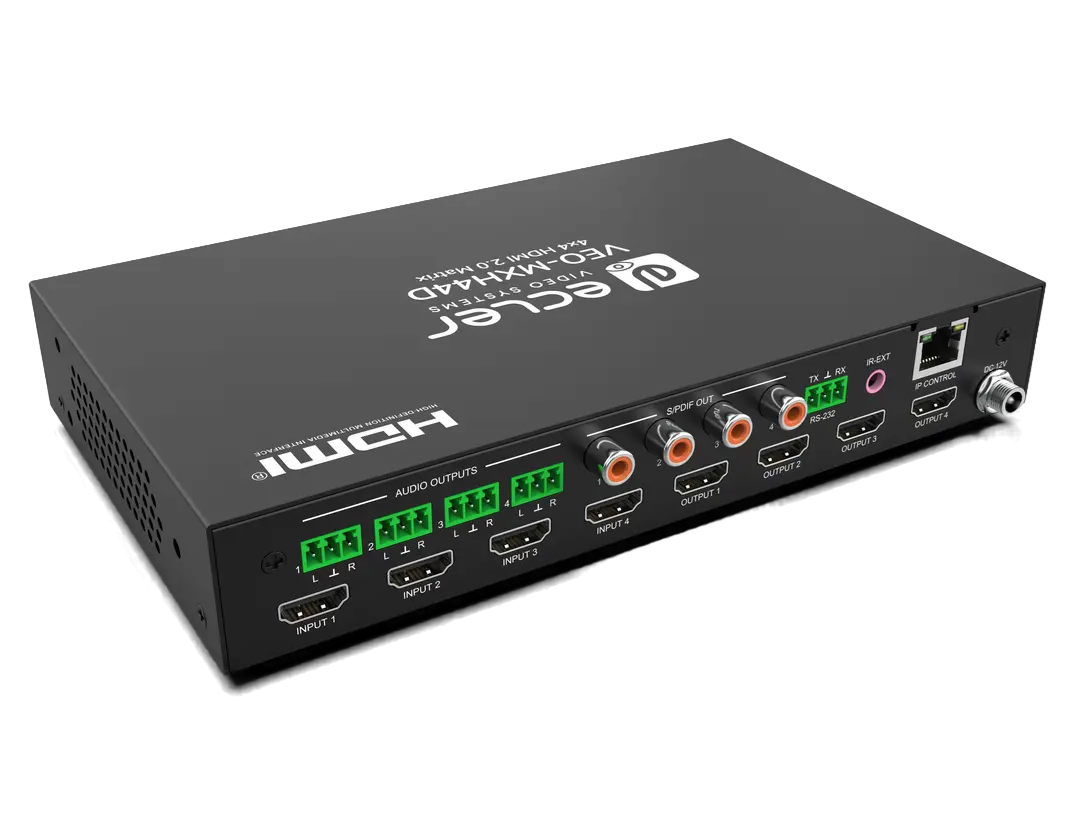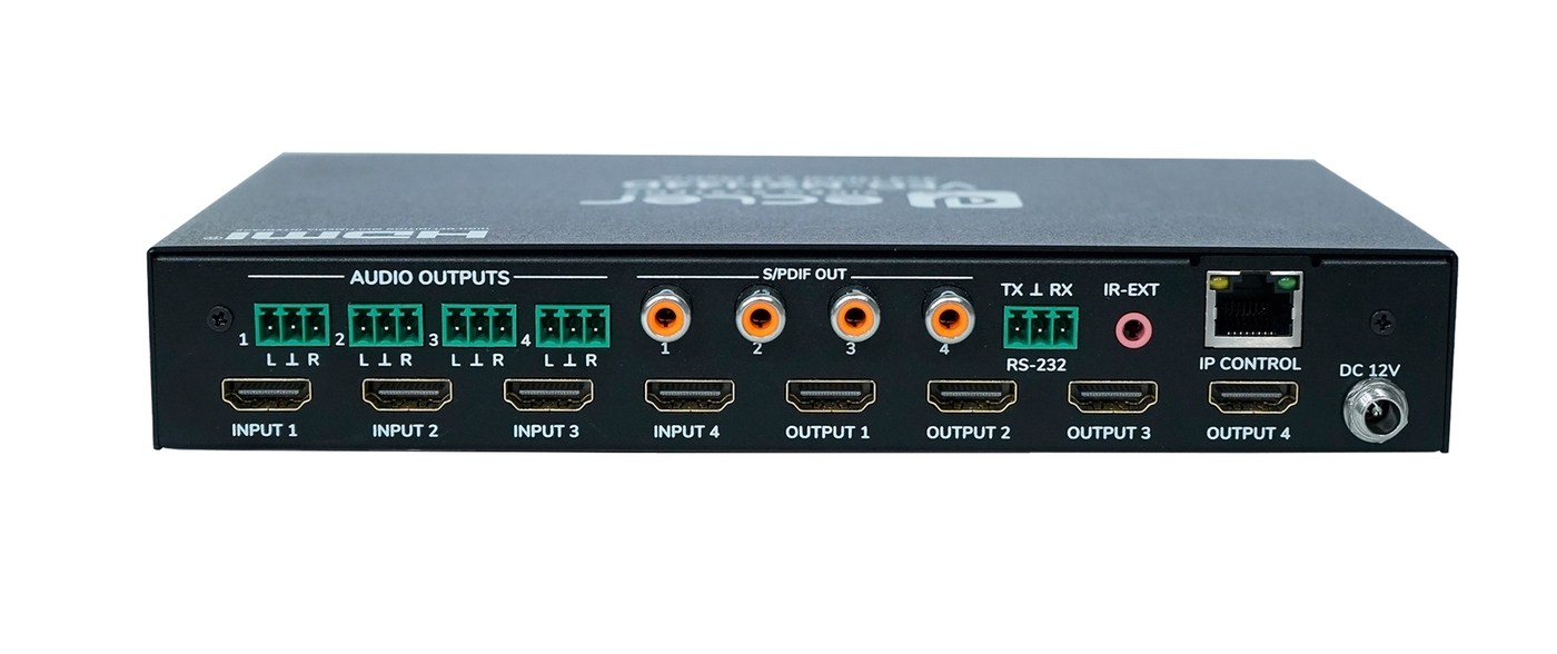 | Выходы | 4 – HDMI, тип А (розетка) 4 – небалансное стерео, клеммный блок 4 – цифровое стереоаудио S/PDIF, разъем RCA (розетка) 1 – ИК, разъем miniJack 3,5 мм (розетка) |
