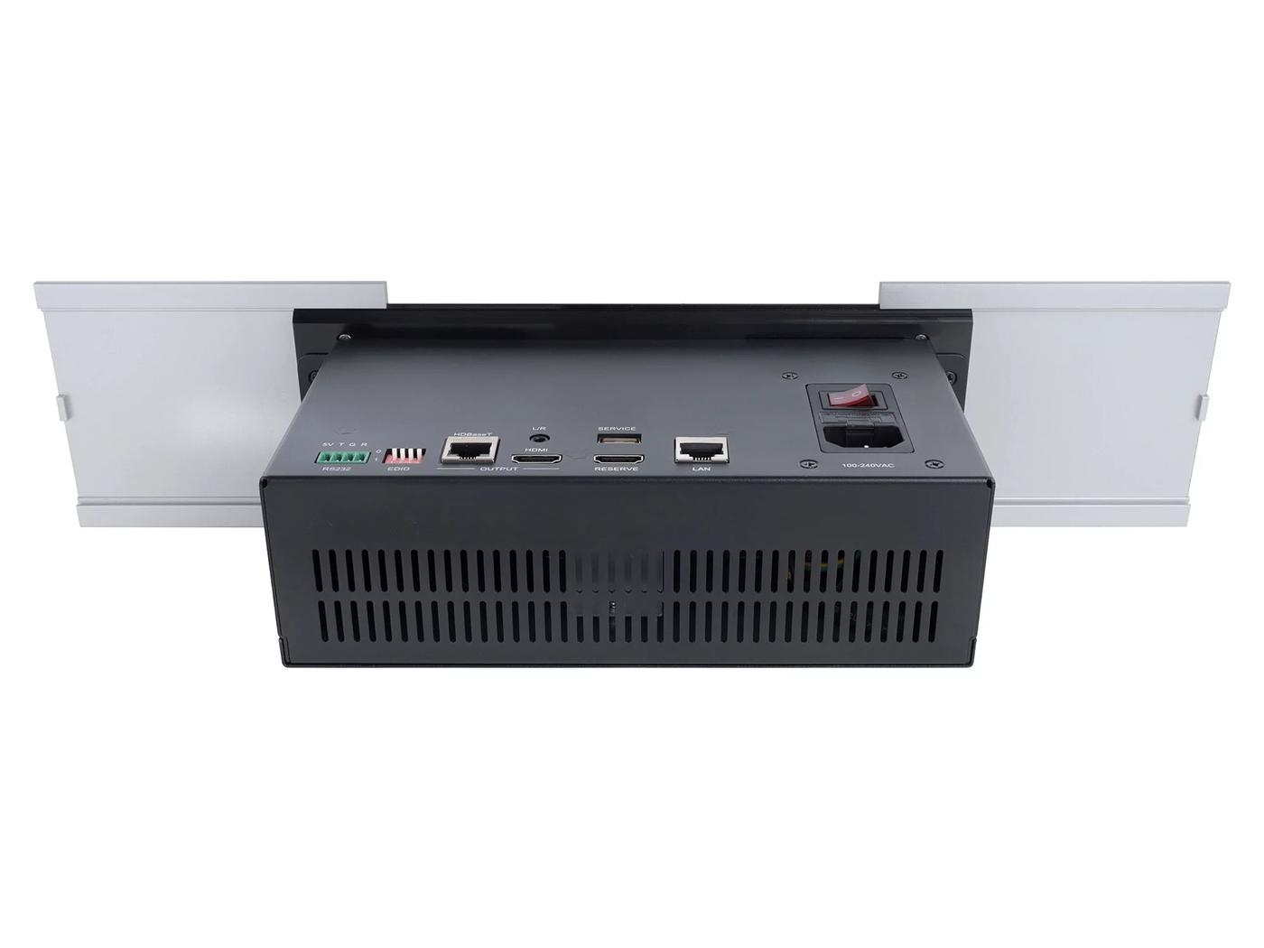 Расположенные сверху сдвижные декоративные крышки серебристого цвета прикрывают необходимые органы управления прибором и ряд разъёмов для подключения оборудования конечного пользователя — ноутбуков и мобильных устройств. Эти подключения обеспечивают электропитание оборудования (как сетевым напряжением, так и через питающий порт USB) и получение от него видео и аудиосигналов. Такие сигналы коммутируются и обрабатываются прибором, результирующие аудио и видеосигналы выводятся на разъёмы в нижней части прибора. Здесь же расположены вводы для подачи электропитания и другие вспомогательные разъёмы и элементы настройки прибора.