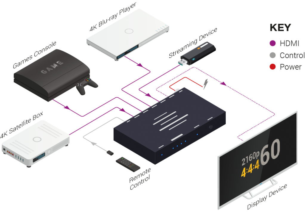 Даже с учетом того, что EXP-SW-0401-H2 является автономным устройством, часто бывает так, что расстояние от дисплея до коммутатора оказывается слишком большим для стандартного HDMI или, возможно, добавляются непредусмотренные дисплеи. Благодаря функции регенерации сигнала, к выходу коммутатора можно подключать дополнительные устройства: комплект удлинителей или разветвитель, - и все это без задержки и ухудшения качества сигнала.