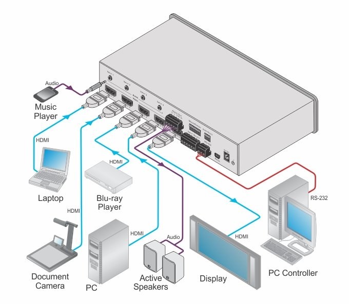 различные возможности управления — кнопками на передней панели, замыканием «сухих» контактов, через интерфейс RS-232 и ИК-пульт