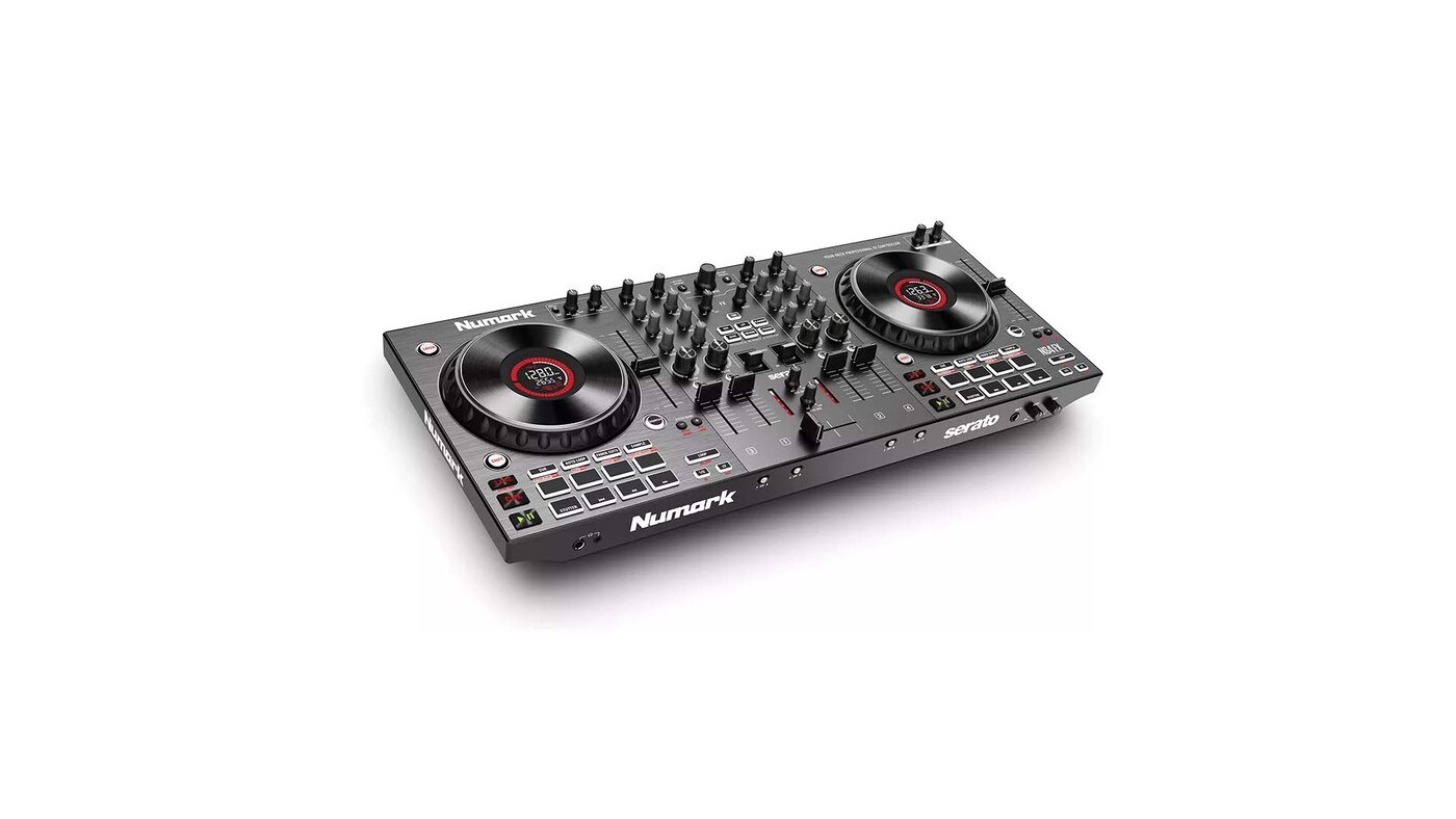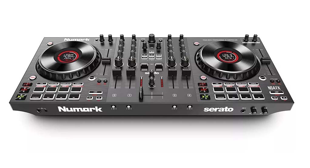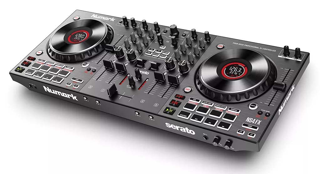 Numark NS4FX - четырехканальный DJ-контроллер с 6-дюймовыми емкостными джогами с цветным дисплеем, секцией эффектов, 8 пэдами на каждой деке и 2 микрофонными входами.