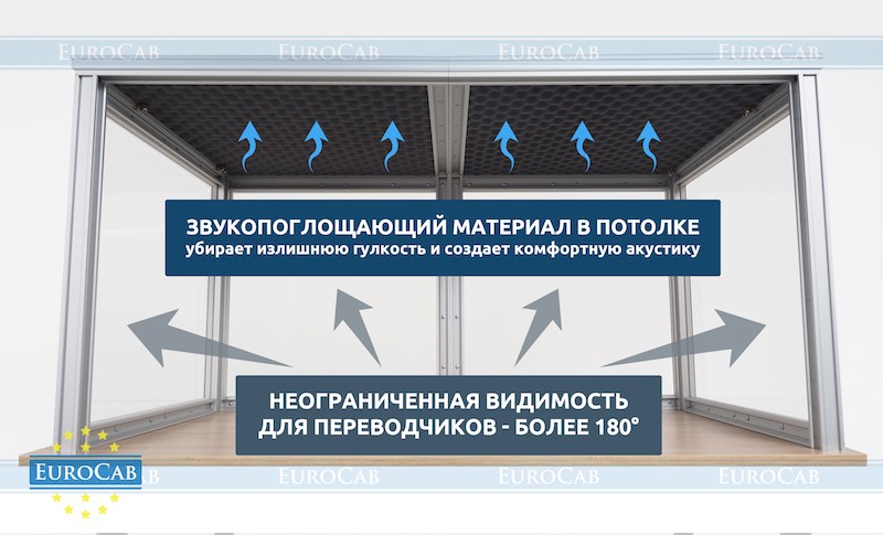 Настольная кабина Reinvox EuroCab-2 отличается небольшой массой каждой отдельной панели. С установкой справится любой человек без особых навыков. Кабина безупречно подходит для мобильной работы с системой синхронного перевода любой марки - Bosch, Reinvox, Sennheiser, Brahler, Taiden и прочих. Потолок в кабине имеет звукопоглощающее покрытие, которое предотвращает попадание в микрофон переводчика отраженных сигналов в широком диапазоне частот. Таким образом достигаются качественные характеристики звучания в наушниках слушателей.