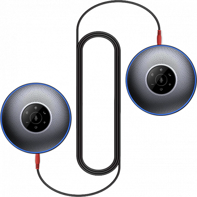 eMeet OfficeCore M220 - набор из двух портативных спикерфонов для захвата. Они образуют последовательное соединение, где один спикерфон выступает ведущим, а второй - ведомым, работая как единое целое. Подключение к ПК осуществляется через беспроводной USB-адаптер (входит в комплект поставки), USB-кабель или AUX (аналоговый аудиовход).