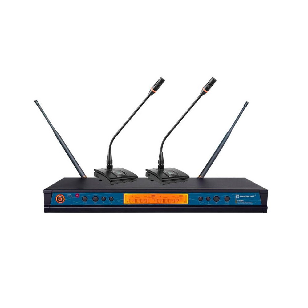 Relacart ER-5900MW - беспроводная микрофонная радиосистема с двумя конференц-микрофонами, с конденсаторными капсюлями, с продолжительностью работы до 8 часов от батареек типа АА.