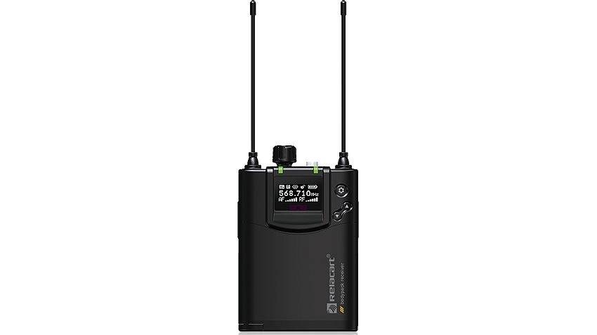 Relacart PM-320R - беспроводной радиоприёмник для работы с передатчиком системы персонального мониторинга Relacart PM-320T, с частотой 554 МГц - 936 МГц, с 2-мя антеннами, с 1/8" TRS выходом на наушники, с дистанцией работы до 100 метров, с работой до 8 часов от двух 1,5-вольтовых батареек АА типа.