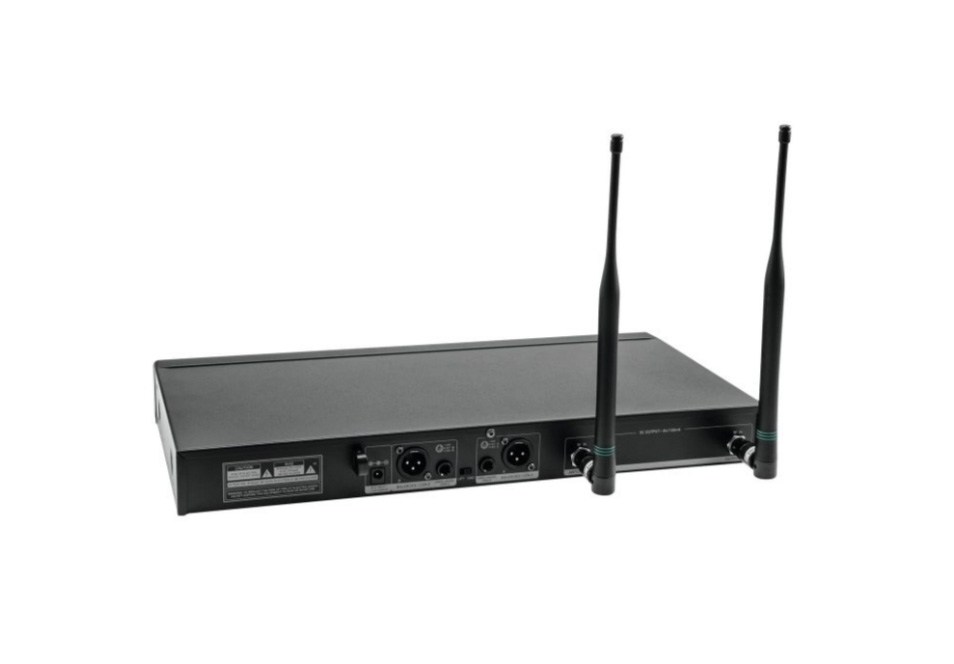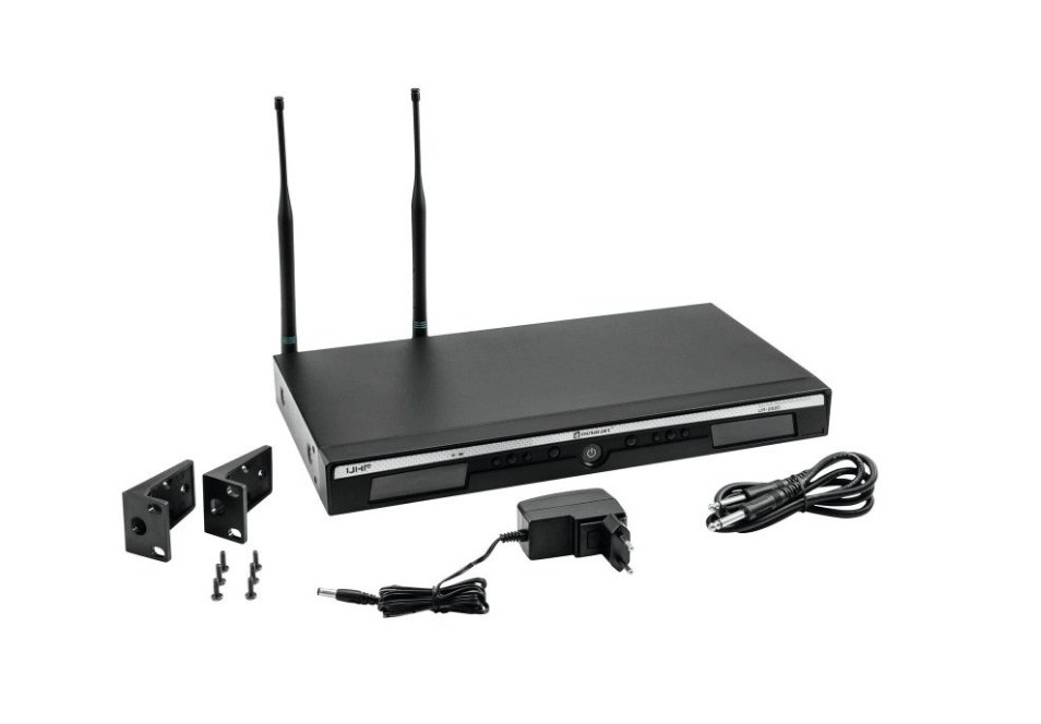 В комплект входят: приемник, 2 поясных передатчика, 2 петличных микрофона, набор для установки в рэк, 2 отсоединяемые антенны, адаптер питания, руководство пользователя, 4 батарейки типа АА и 2 кабеля с коннекторами Jack TS 1/4" (длиной по 1 метр).