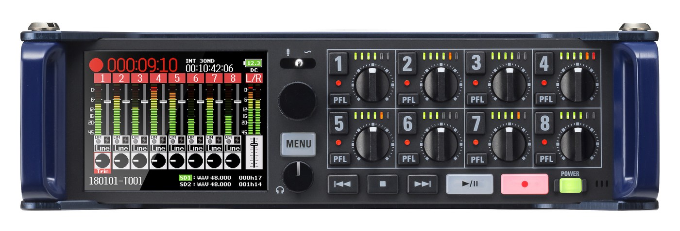 Zoom F8n портативный рекордер/микшер и USB аудиоинтерфейс, который имеет восемь входов и четыре выхода, 8 XLR/TRS комбо-входов, 8 микрофонных предусилителей, Time Code I/O и выходы mini-XLR, позволяющий записывать в разрешении 24 бит/192 кГц.