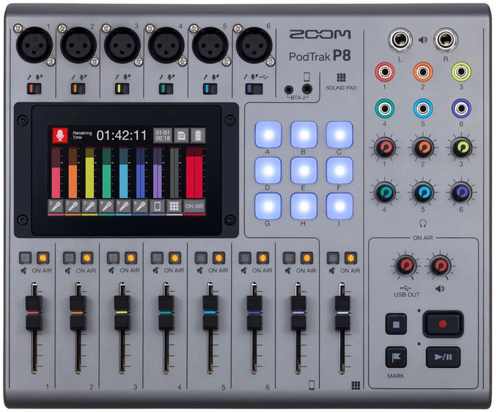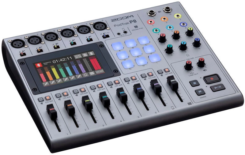 Zoom PodTrak P8 - восьмиканальная портастудия. Она представляет собой великолепное решение для записи интервью, подкастов, читки сценария и комментариев. Здесь вы найдете 6 микрофонных входов XLR, 6 выходов для наушников 1/8" с собственными регулировками уровня громкости и 8 фейдеров каналов в расчете на 6 человек + отдельный канал для записи звонков. 9 пэдов с 4 банками позволяют вам запускать звуковые сэмплы вроде вступительной музыки, джинглов, рекламы и т.д. В портастудии имеется цветной экран с сенсорным управлением, с которого вы можете настраивать уровень гейна, коммутацию и эффекты обработки.