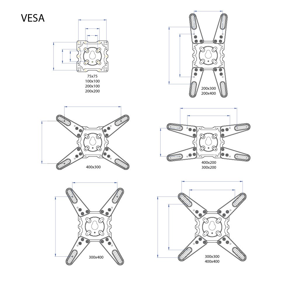 | Крепежные отверстия (VESA) | 75 x 75 100 x 100 100 x 200 200 x 100 200 x 200 300 x 200 300 x 300 400 x 200 400 x 300 400 x 400 |