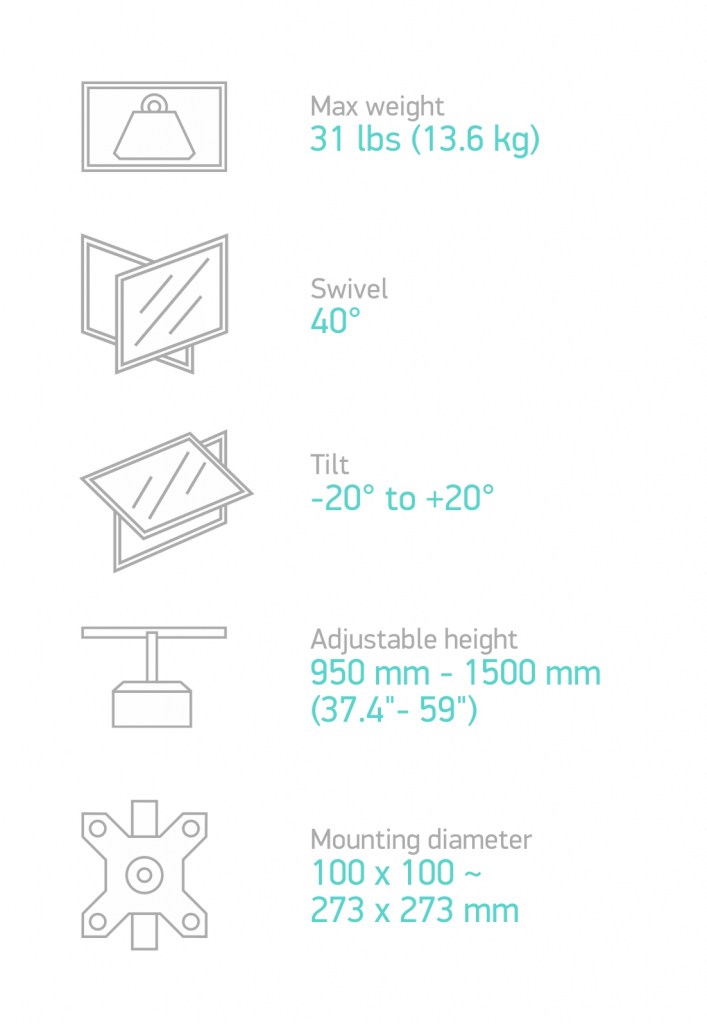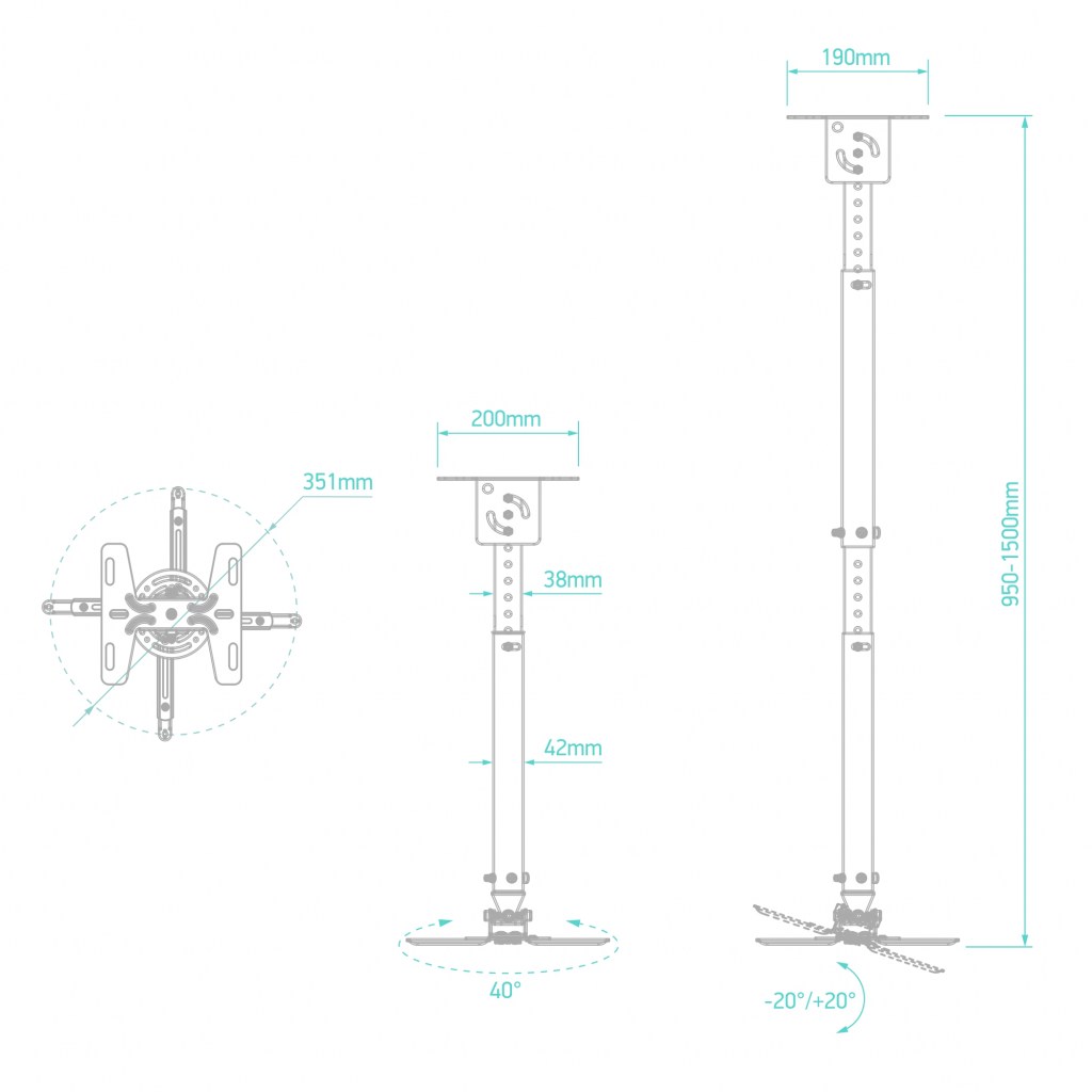 Данный кронштейн позволяет разместить проектор на высоком потолке. Регулировки отступа от потолка на расстоянии от 950 до 1500 мм, наклон и поворот проектора. Универсальное крепление проектора на четыре точки (максимальный разлет креплений 351 мм). Кабель можно спрятать в трубе.