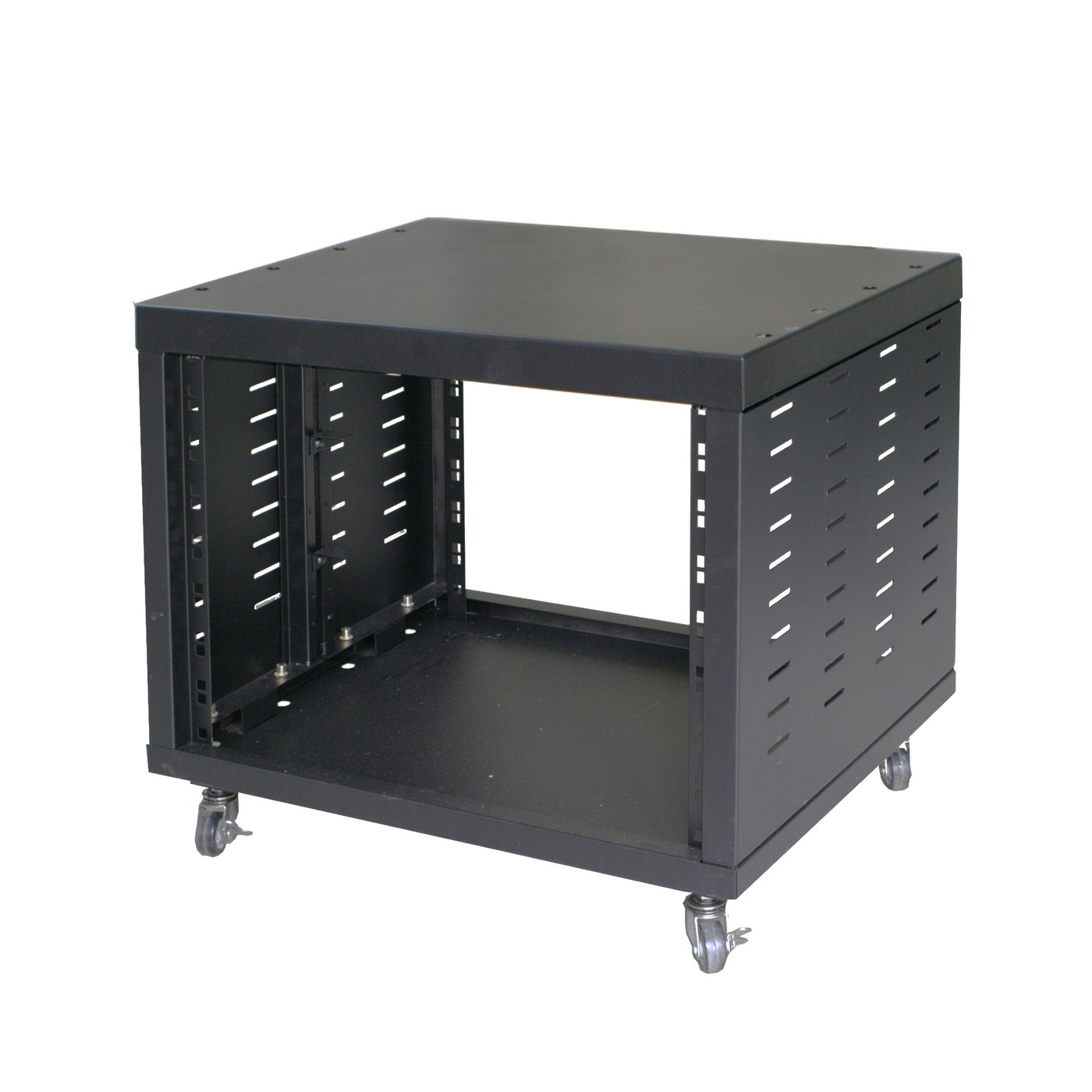 Tempo RK8W - рэковый шкаф на колесиках (рэк-шкаф) на 8 мест. Выполнен в черном цваете. Конструкция предназначена для удобного, компактного, технологичного и безопасного крепления оборудования. Благодаря боковым перфорированным стенкам рэковой стойки улучшается отлаждение приборов.