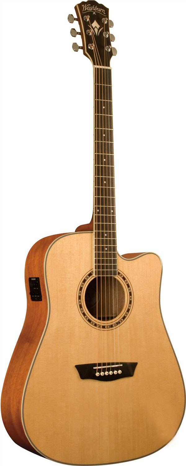 Washburn WD10CE - электроакустическая гитара, тип корпуса - "дредноут", с вырезом для доступа к нижним ладам, верхняя дека - отборная ель, корпус и гриф - махагони, накладка грифа и бридж - палисандр, активный темброблок Fishman 301T со встроенным тюнером и двухполосным эквалайзером, цвет натуральный.