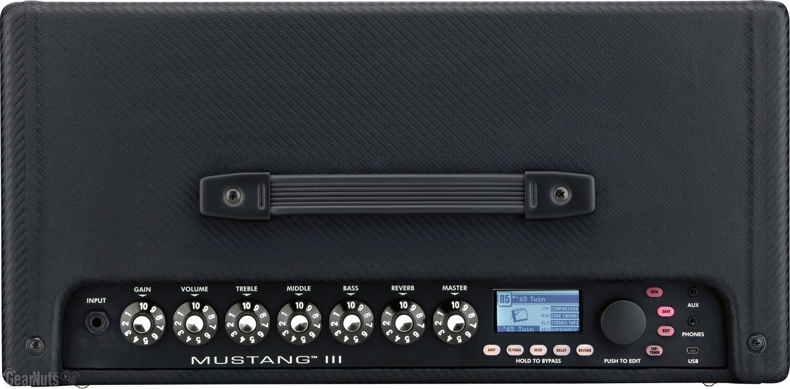 Регуляторы: Gain, Volume, Treble, Middle, Bass, Reverb, Master; Data Wheel; soft keys for Amp Select, Stomp Edit, Modulation Edit, Delay Edit, Reverb Edit, Utility, Save, Exit, and Tap/Tuner