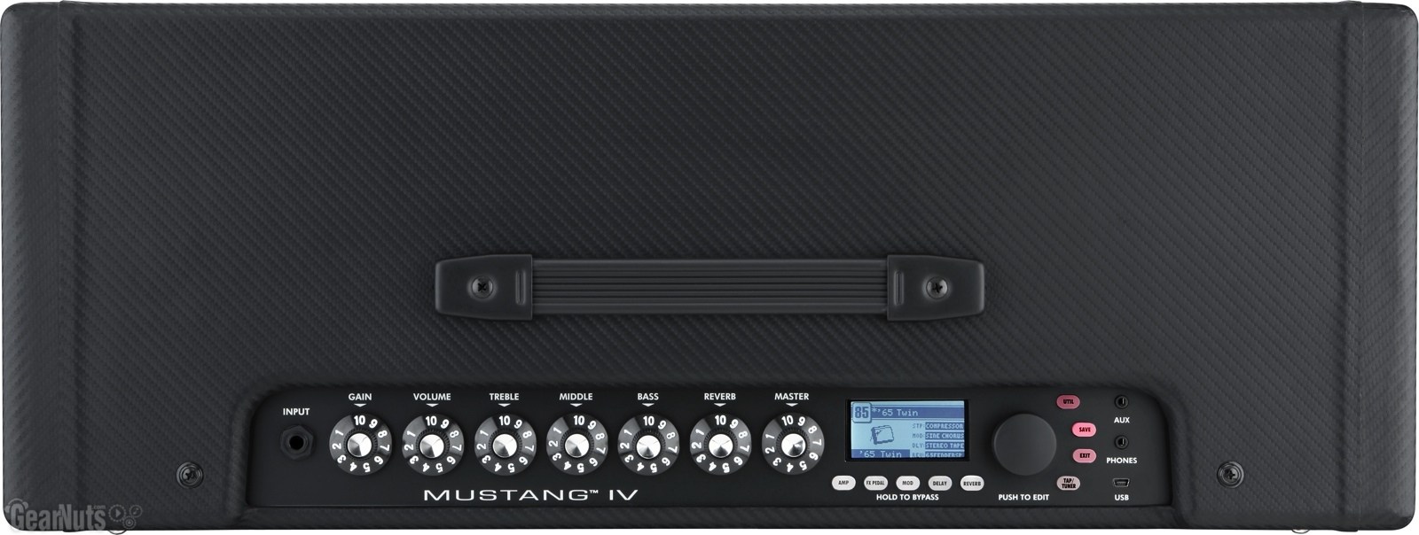Регуляторы: Gain, Volume, Treble, Middle, Bass, Reverb, Master; Data Wheel; soft keys for Amp Select, Stomp Edit, Modulation Edit, Delay Edit, Reverb Edit, Utility, Save, Exit, and Tap/Tuner
