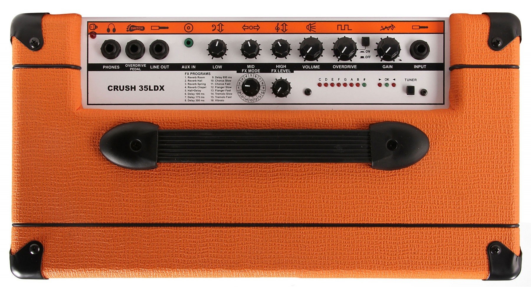 20 Вт гитарный комбик CR35LDX от ORANGE – идеальный комбик для практических занятий и не только. CR35LDX имеет 10" динамик, Aux вход для MP3 или CD, легендарный Orange корпус, покрытый тканью Tolex с тканевой решеткой, а также легендарный иероглиф PiX и конечно же логотип компании в рамке. Комбик не только классно выглядит, как только Вы его включите, сразу поймете – это настоящий Orange! Он подходит как для практических занятий, так и для всех уровней гитаристов, поскольку в нем есть 3-полосный эквалайзер, OverDrive и Master Volume, которые дают полное управление тоном плюс встроенный процессор эффектов, включая Reverb, Chorus, Flange и Tremolo. А выход для наушников позволяет бесшумно репетировать. Кроме того, в CR35LDX есть возможность переключения овердрайва ножной педалью. CR35LDX – один из самых продаваемых и рекомендуемых комбоусилителей во всем мире.