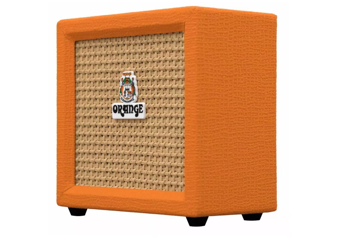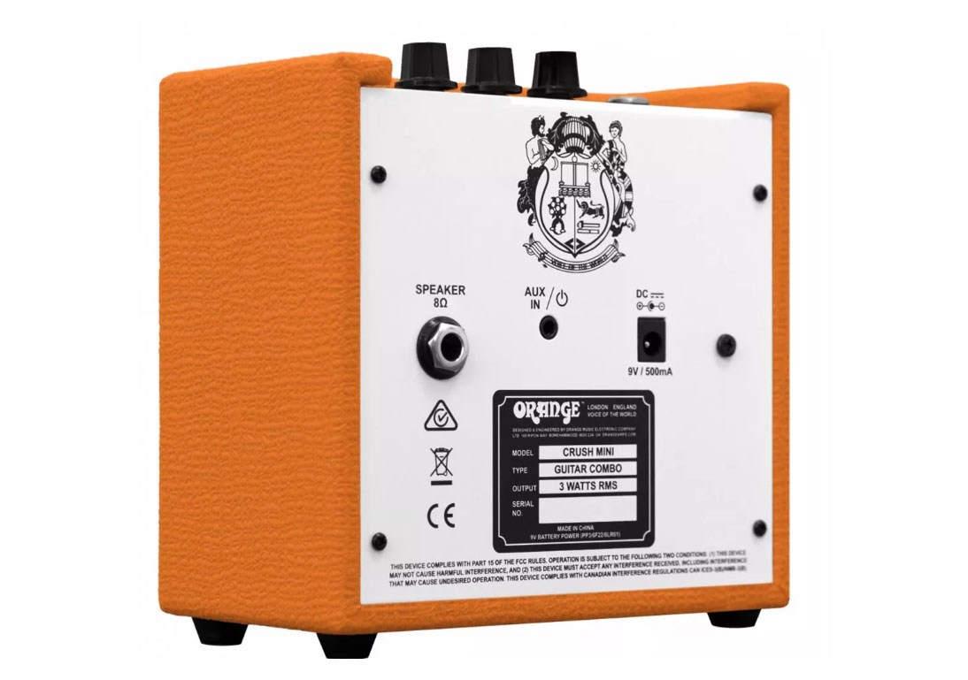 Orange Crush Mini - портативный одноканальный гитарный комбоусилитель, мощностью 3 Вт, питается от 9-вольтной батареи, со входом Aux, выходом для наушников и 8-омным выходом для кабинета.
