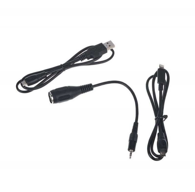 В комплекте: MIDI адаптер, кабель USB, кабель Lightning и библиотеку сэмплов SampleTank 4 SE с 2000 инструментов и 30 Гб сэмплов.