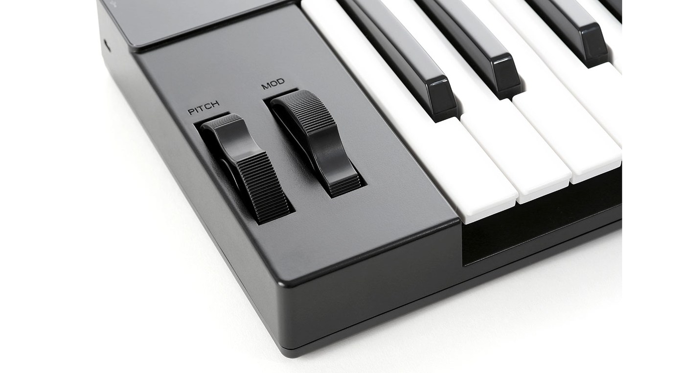 Клавиши MIDI-клавиатуры IK Multimedia iRig Keys 37 Pro чувствительный к скорости нажатия. Доступны колесики питч-бенда и модуляции, кнопки переключения рабочих октав и настраиваемая ручка регулировки. Также здесь имеется вход для педали сустейна/экспрессии.