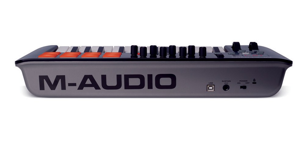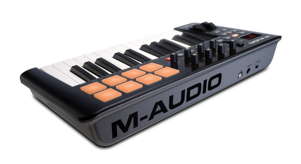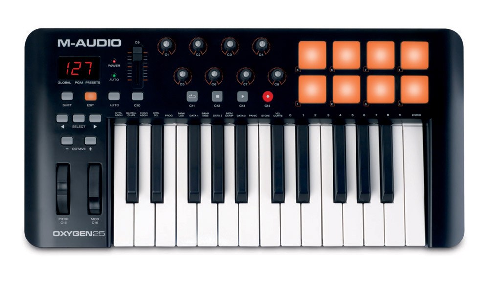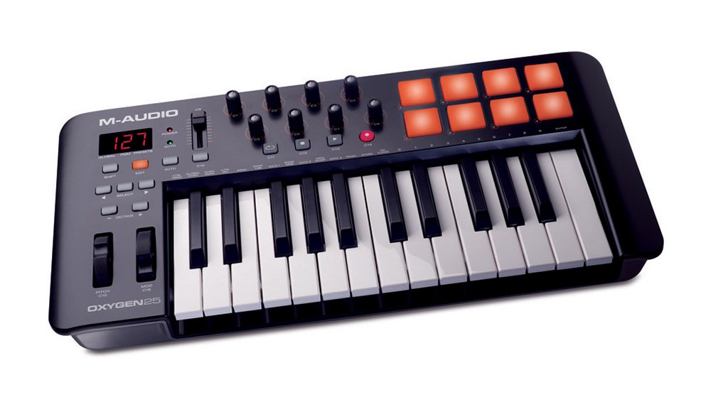 M-Audio Oxygen 25 MK IV – MIDI клавиатура с 25 полноразмерными клавишами синтезаторного типа, назначаемым фейдером, 8 пэдами, 8 поворотными регуляторами, колесами питча и модуляции.