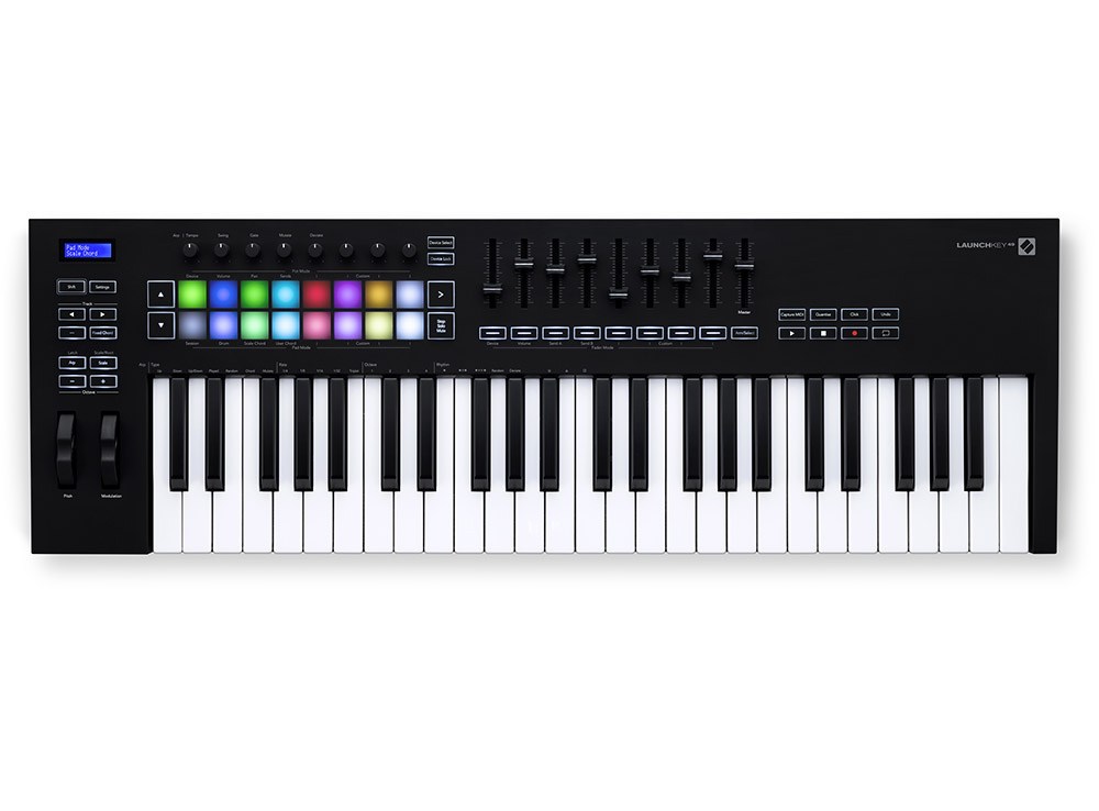 Novation Launchkey 49 MK3 - MIDI клавиатура на 49 клавиш с 16 RGB-пэдами, 8 кнобами и 9 слайдерами, экраном 16x2, режимами гамм, аккордов и арпеджио, широким пакетом софта в комплекте.