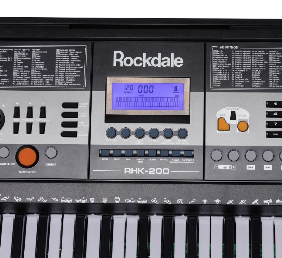 Rockdale Keys RHK-200 - отличный синтезатор, который обеспечивает насыщенное звучание и приятные тактильные ощущения, а также отлично подходи для обучения. Инструмент имеет качественную клавиатуру на 61 клавишу, которая может работать в динамическом режиме с учетом скорости и силы нажатия. За хороший звук отвечают встроенные динамики, которые максимально детально передают вашу игру, а также могут использоваться для воспроизведения любых композиций при помощи порта USB и аудиовхода. Помимо этого, для творческих экспериментов вам доступно 200 тембров различных музыкальных инструментов, 200 ритмов и возможность самостоятельно задать необходимый ритм, а свои треки вы можете записать непосредственно в память синтезатора. Для начинающих музыкантов полезными будут встроенные режимы обучения с несколькими уровнями сложностями, а также автоаккомпанемент и функция упрощенной аппликатуры аккордов.