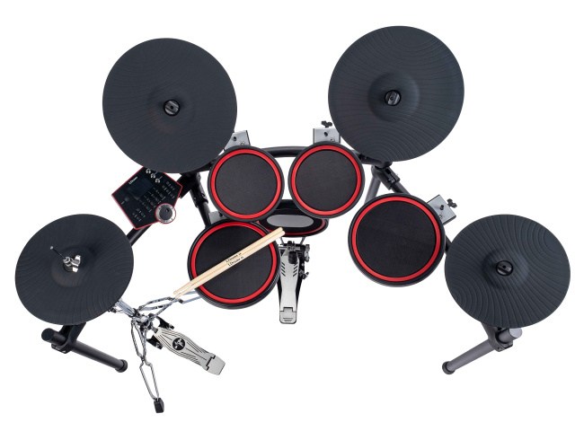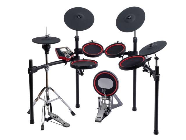 Ldrums MK-7X-Red - электронная ударная установка включает в себя звуковой модуль DSP-7001, один 10" пэд малого барабана, два 10" пэда томов, один 12" пэд тома, один 10" пэд бас-барабана, четыре 12" пэда тарелок (хай-хэт, райд, два крэша), а также 2 ножных контроллера (бас-бочка и хай-хэт) и металлическая стойка для хай-хэта.