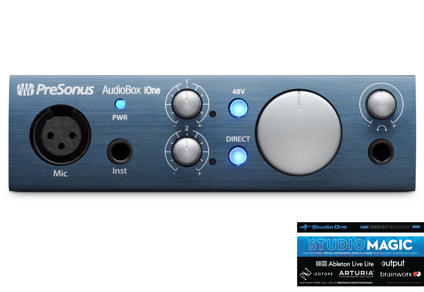 AudioBox iOne - компактный профессиональный внешний USB-аудиоинтерфейс, предназначенный для мобильного применения. Его АЦП и ЦАП работают в форматах вплоть до 24 бит/96 кГц, он обладает одним микрофонным входом, одним инструментальным и двумя TRS-выходами, также на борту можно найти выход на наушники формата 1/4" TRS Jack.