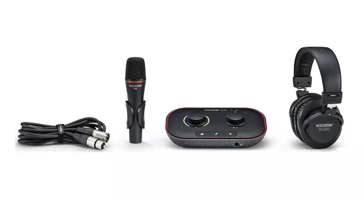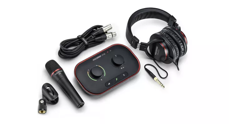 Focusrite Vocaster One Studio - фирменный студийный комплект, состоящий из USB-аудиоинтерфейса Vocaster One, ручного динамического микрофона DM1, мониторных наушников HP60v, 3-метрового микрофонного кабеля, держателя микрофона и софта.