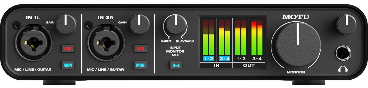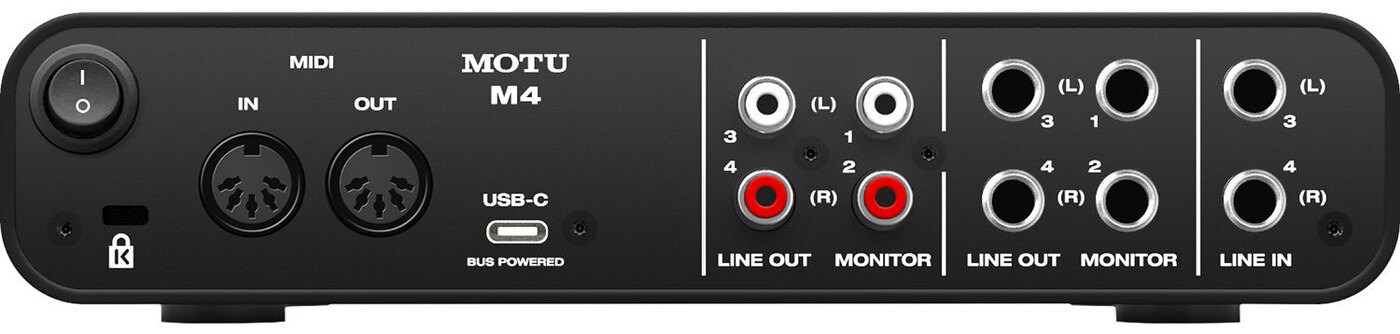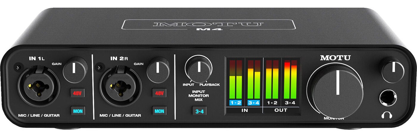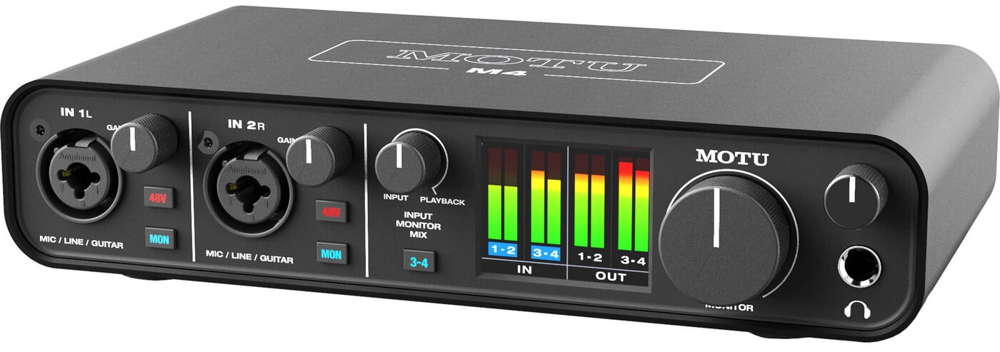 MOTU M4 - 4-ех канальный USB-C аудиоинтерфейс, снабженный конвертерами c применяемой в намного более дорогих устройствах технологией ESS Sabre 32 Ultra. На основных выходах интерфейс способен обеспечить динамический диапазон до 120 дБ. Выход для наушников также использует конвертеры ESS. Микрофонные предусилители позволяют получить исключительно чистый звук для записи и мониторинга. Благодаря экспертной разработке USB драйверов интерфейс имеет лучшую в своем классе скорость мониторинга входного сигнала с превосходным показателем круговой задержки всего 2,5 мс (96 кГц, буфер 32 сэмпла). Оптимальные уровни сигнала очень важны при записи, и М4 снабжен подробными цветными LCD индикаторами уровней для всех входов и выходов. Драйвер интерфейса оснащен функцией Loopback, позволяющей подавать выходной сигнал компьютера на его вход и смешивать его с сигналами микрофонных или линейных входов интерфейса для подкаста и стриминга. В комплект входят 2 DAW, более 100 виртуальных инструментов, а также 6 ГБ лупов и звуков.
