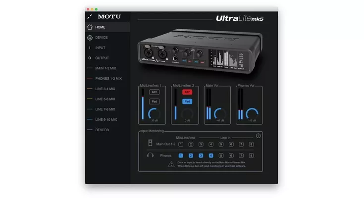 MOTU UltraLite MK5 - профессиональный звуковой интерфейс с двумя предусилителями, микшером и аппаратным DSP.