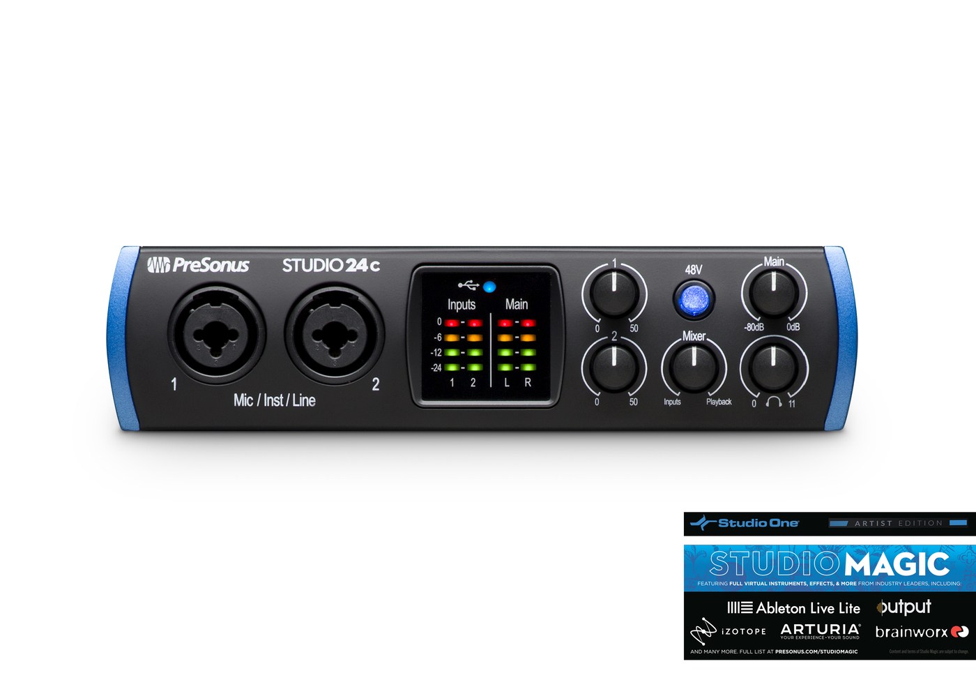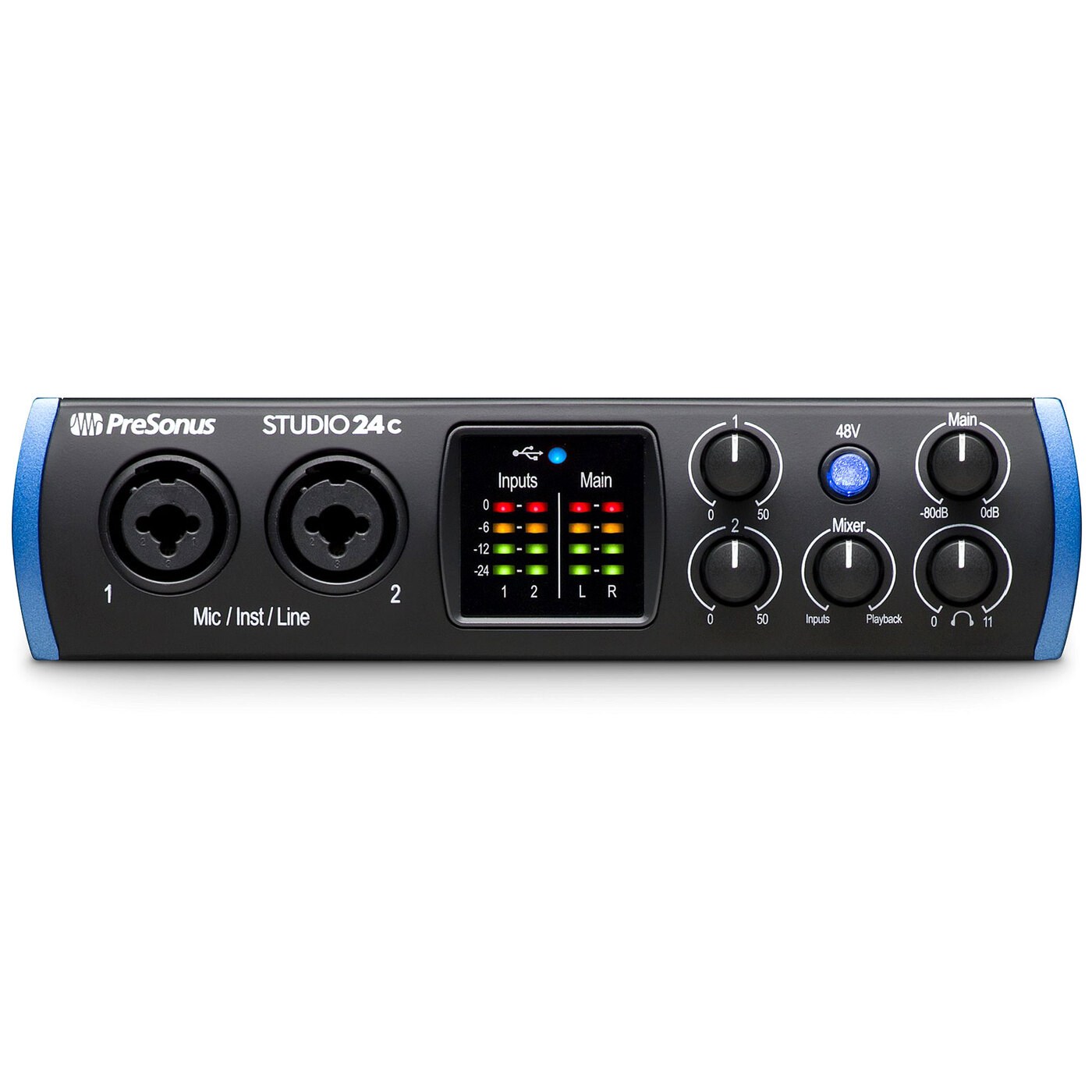 PreSonus Studio 24c - портативный аудиоинтерфейс для профессиональной записи в условиях домашней студии или в дороге. Высококачественные ацп и цап на каждом выходе и входе и фирменные микрофонные предусилители PreSonus® XMAX-L обеспечивают потрясающее качество записи при разрешении до 192 КГц и последующего воспроизведения. Аудиоинтерфейс оборудован двумя комбинированными микрофонными/инструментальными/линейными входами с поддержкой фантомного питания +48 В, двумя линейными выходами, MIDI входом и выходом, выходом на наушники и USB-C портом для связи с компьютером. На передней панели также расположены энкодеры управления и светодиодные индикаторы уровня звука. В комплекте поставки идет фирменная цифровая звуковая рабочая станция PreSonus Studio One и набор потрясающих плагинов Studio Magic. Особенности PreSonus Studio 24c: Питание по USB. Мобильность и небольшие размеры. Все необходимые входы и выходы для проведения полноценной записи. Фантомное питание для конденсаторных микрофонов. Фирменные микрофонные предусилители PreSonus® XMAX-L.