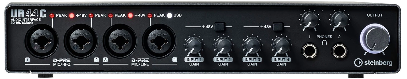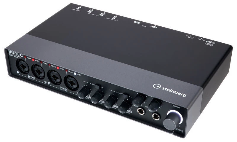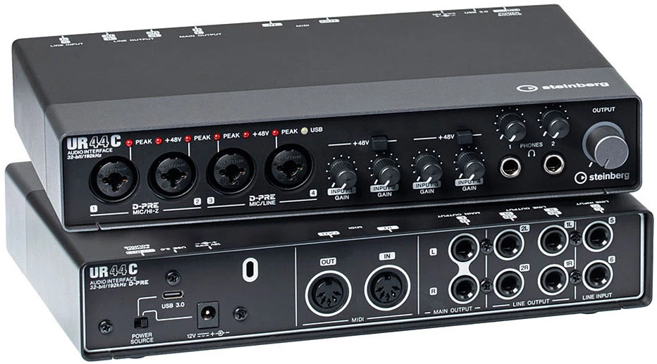 Steinberg UR44C - компактный USB 3.0 аудиоинтерфейс со входом USB-C от компании Steinberg. Он оснащен четырьмя микрофонными предусилителями D-PRE и имеет разрядность аудио/частоту дискретизации 32 бита/192 кГц, что позволяет добиться замечательного качества звучания. Аудиоинтерфейс поддерживает мониторинг сигнала напрямую, без задержки. Специальная регулировка позволяет подмешивать входной и обработанный сигналы для создания оптимального мониторного микса. Вход и выход MIDI позволяет вам подключать различные контроллеры, синтезаторы и другие устройства.