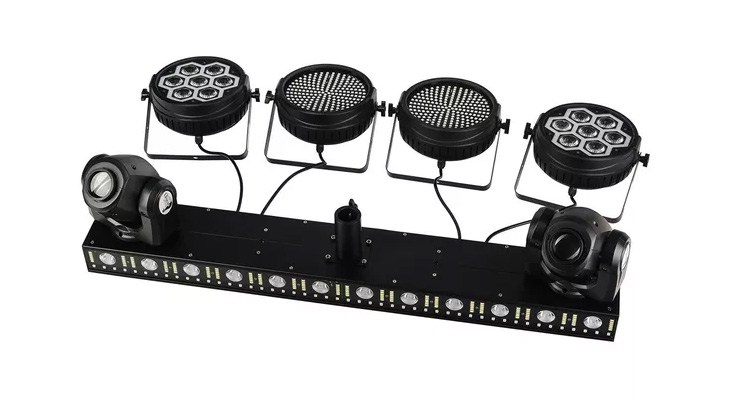 LFocus FO-1205Z-B - комплект световых эффектов, состоящий из линейного светодиодного прожектора с 2 вращающимися головами, 2 светодиодных прожекторов PR-710E, 2 светодиодных прожекторов PR-220E, пульта дистанционного управления, кабелей питания, DMX и монтажных аксессуаров.