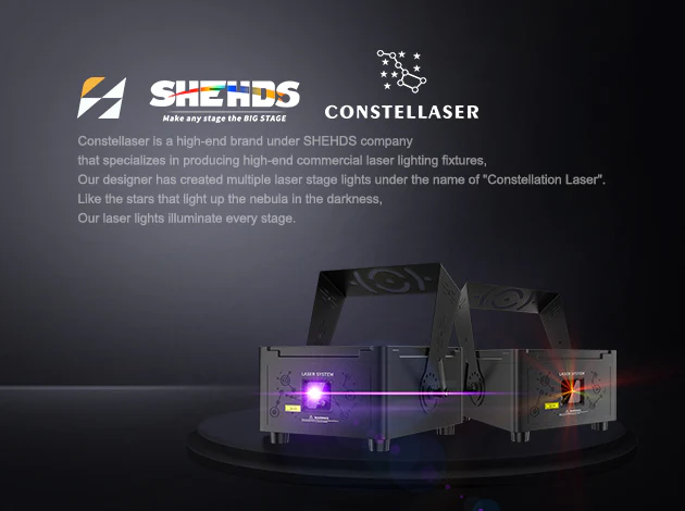 SHEHDS Constellaser APP Control (12W) - лазерный прибор для сценического использования. Поддерживается беспроводное дистанционное управление лазером с помощью приложений для Android и IOS, позволяющих управлять параметрами лазерного излучения и настраивать меню.