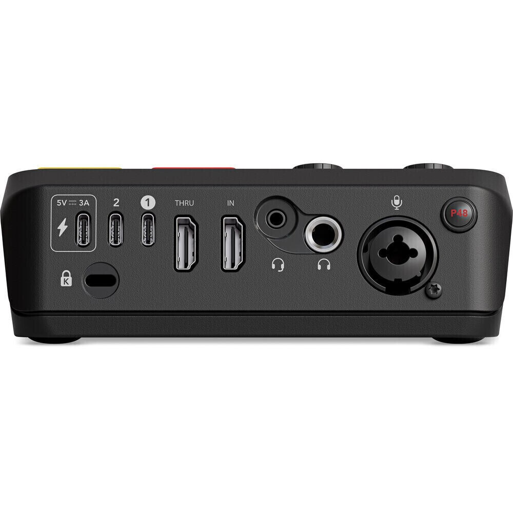 RODE Streamer X - аудиоинтерфейс с функцией видеозахвата, оснащенный микрофонным предусилителем, разъемом TRRS для подключения гарнитуры, встроенным беспроводным приемником для подключения устройств RØDE Series IV, 2 разъемами USB-C, 4 настраиваемыми пэдами и 2 портами HDMI.