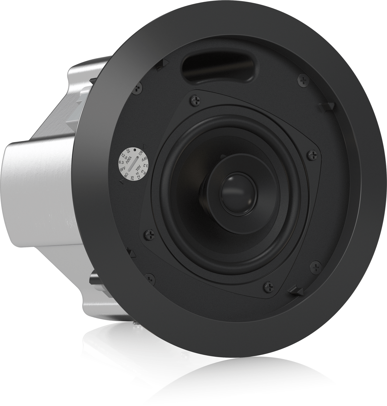 Для воспроизведения аудиосигнала в Tannoy CVS 401 BK присутствуют 4-дюймовый полипропиленовый вуфер с бумажным конусом, а также 0.79-дюймовый коаксиальный драйвер с мягким куполом. Максимальная мощность динамиков Tannoy CVS 401-BK может достигать 120 Вт, а рекомендуемая мощность при коммутации с 8-омным усилителем составляет 60 Вт. Акустическую систему Tannoy CVS 401 BK позволяется подключать к трансляционным сетям с напряжением 70 и 100 Вольт. В первом случае доступная мощность будет 25, 12.5, 6.3 и 3.2 Вт, а во втором только 25, 12.5 и 6.3 Вт. Максимальное звуковое давление может доходить до 105 дБ, а продолжительное – до 107 дБ. Объемную и равномерную зону звукового покрытия обеспечивает дисперсия 125 на 118 градусов (на частоте 1 кГц).